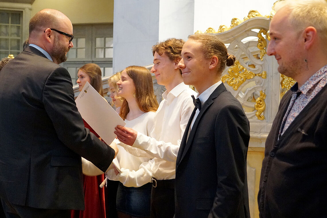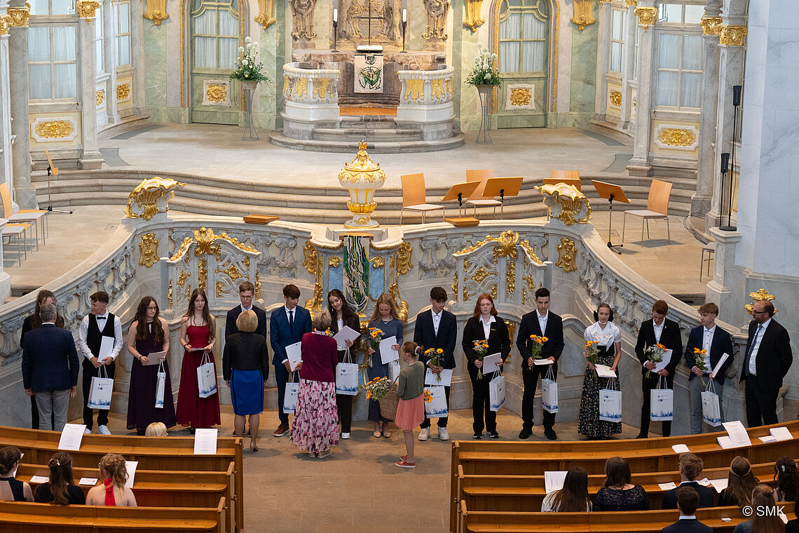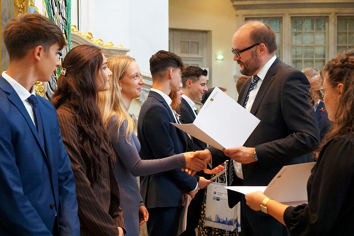 Besonders bemerkenswert sind die Abschlüsse von Milan Kretschmar und Finja Liebsch. Milan hat sein Abitur, Finja die die Oberschule mit der Bestnote 1,0 bestanden. Beide wurden in der Dresdner Frauenkirche bei Veranstaltungen zur festlichen Ehrung der besten schulischen Leistungen für ihren hervorragenden Abschluss ausgezeichnet. Der sächsische Kultusminister Christian Piwarz und der Landtagspräsident Dr. Matthias Rößler überreichten feierlich eine Urkunde und ein Glückwunschschreiben vom sächsischen Ministerpräsident Michael Kretschmer. "Ich habe es sehr geschätzt, diese Auszeichnung zu erhalten“, reflektiert Finja im Anschluss an die Auszeichnungsveranstaltung. „Mir wurde dadurch noch einmal bewusst, was ich durch Fleiß erreicht habe. Außerdem finde ich es sehr schön, dass es dies auch für Oberschüler gibt, um auch deren Leistung zu würdigen."