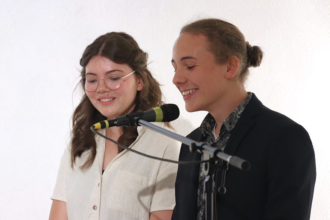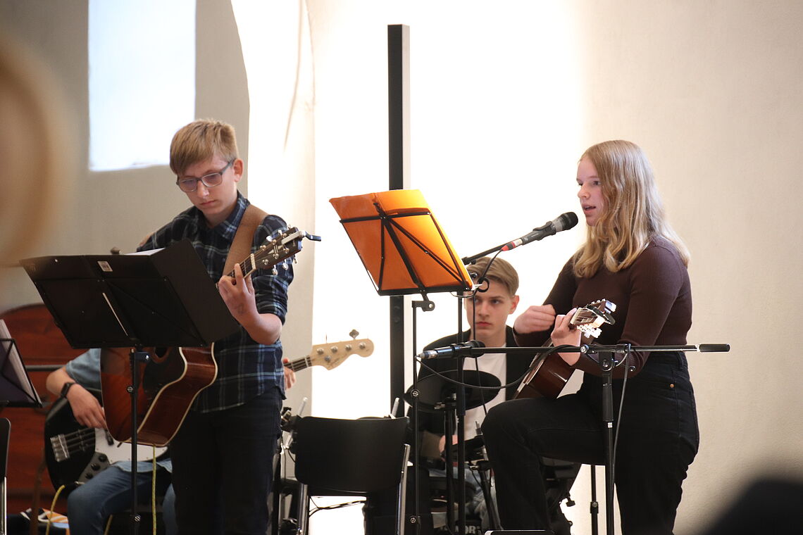 Die Zeugnisausgabe der Oberschülerinnen und -schüler hat die Schulband musikalisch begleitet. Der Schulchor, Chor und Instrumentalistinnen der Klasse 11 sowie ein Bläserchor haben für die Musik beim Gottesdienst zur Abiturzeugnisausgabe gesorgt.