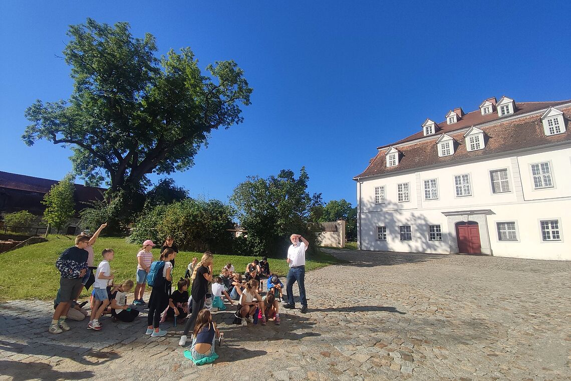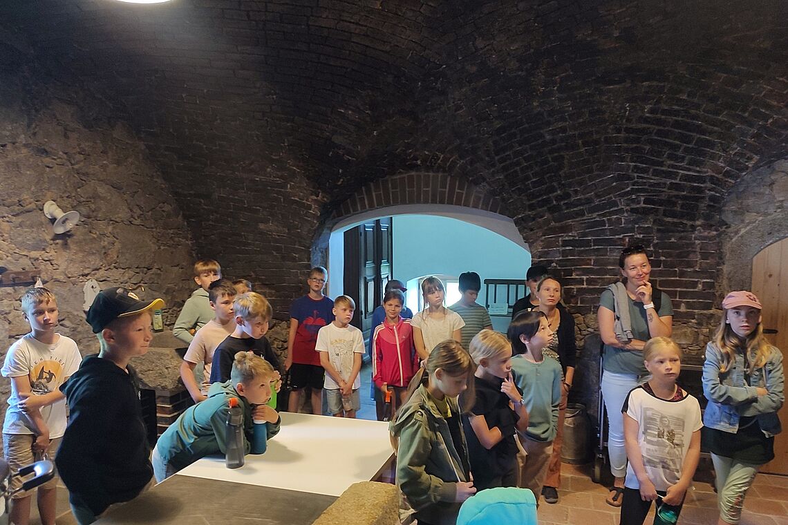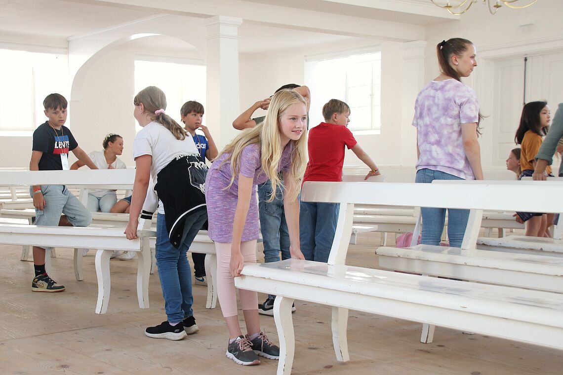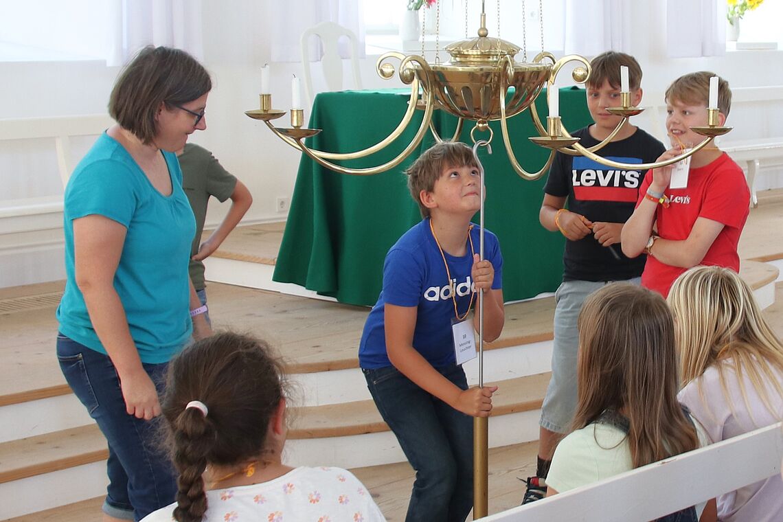 Wie hat Herrnhut-Gründer Zinzendorf gelebt und seinen Alltag verbracht? Warum ist die Kirche so weiß und warum stehen dort die Bänke quer? Bei Führungen durch das Zinzendorfschloss und den Kirchensaal konnten die 5-er alle ihre Fragen loswerden. Und sogar selbst ausprobieren, wie man die Messingleuchter im Kirchensaal zu sich herunterholen kann um zum Beispiel die Kerzen zu wechseln.