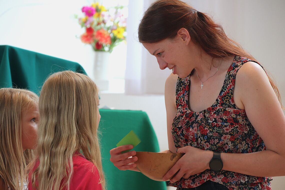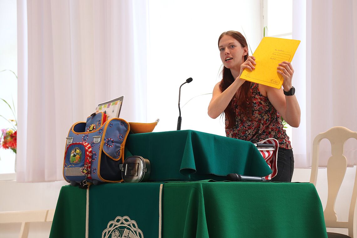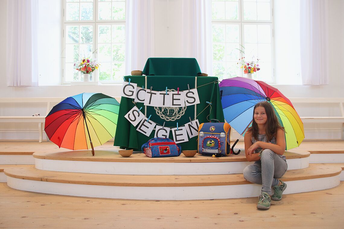 Magdalena Jahr, zuständig für die Kinder- und Jugendarbeit in der Herrnhuter Brüdergemeine, packte beispielhaft ihren alten Schulranzen mit allem, was es für den Schulalltag so braucht - inklusive eines Schirmes. Damit die Azubis, Schülerinnen und Schüler aber nicht nur vor Regen und Sonne geschützt sind, bekamen sie Gottes Segen zusätzlich mit auf den Weg - ganz nach dem Motto "Gott hat einen großen Schirm über mir aufgespannt, bei ihm finde ich Schutz."