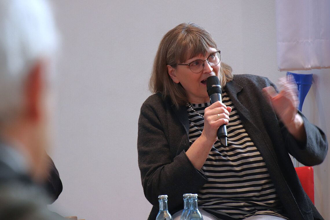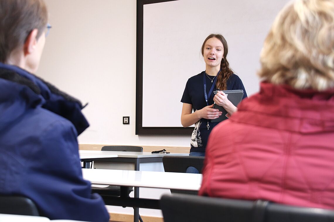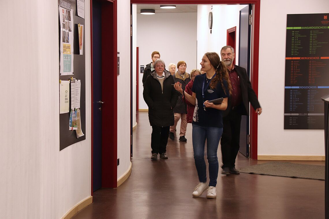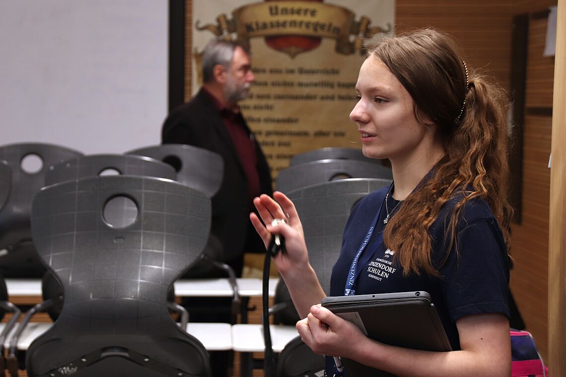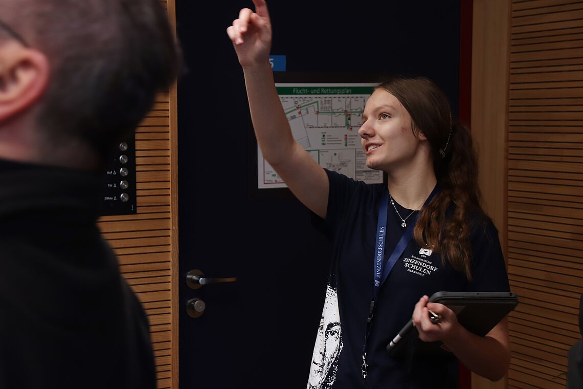 Am Nachmittag gab es dann bei zwei Führungen Einblicke in eine moderne Zinzendorfschule – sowohl in Sachen Pädagogik als auch in die Räumlichkeiten. Dabei konnten sich die Teilnehmenden aussuchen, ob sie lieber die Sicht einer Schülerin auf die EZSH kennenlernen oder mit Katrin Filschke einen Blick auf die Schulentwicklung werfen wollten, die sie als Vorsitzende der Schulstiftung der Evangelischen Brüder-Unität bis heute entscheidend gestaltet.