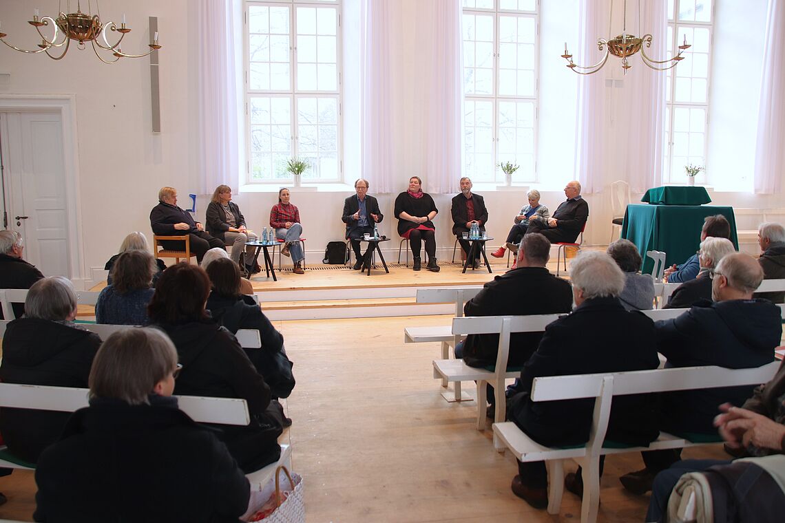 Finale des Tages war das Podiumsgespräch im Kirchensaal, das die Schulgründung des Zinzendorf-Gymnasiums 2005 aus verschiedensten Perspektiven beleuchtete. Mit dabei waren: