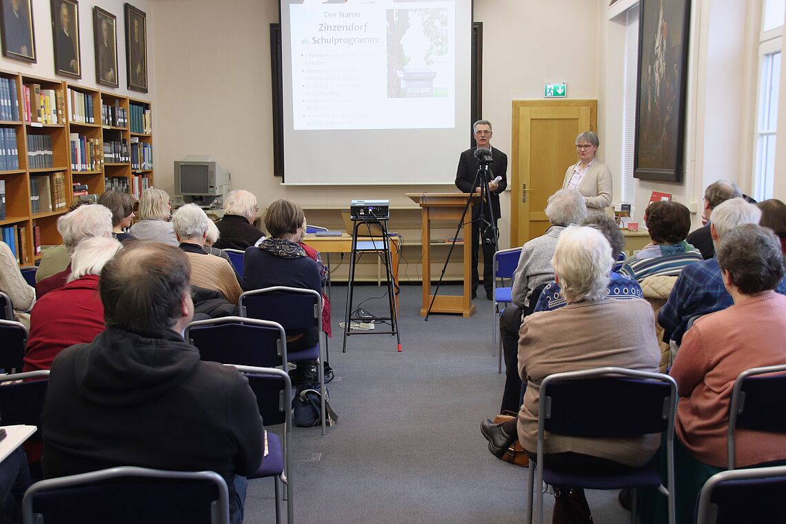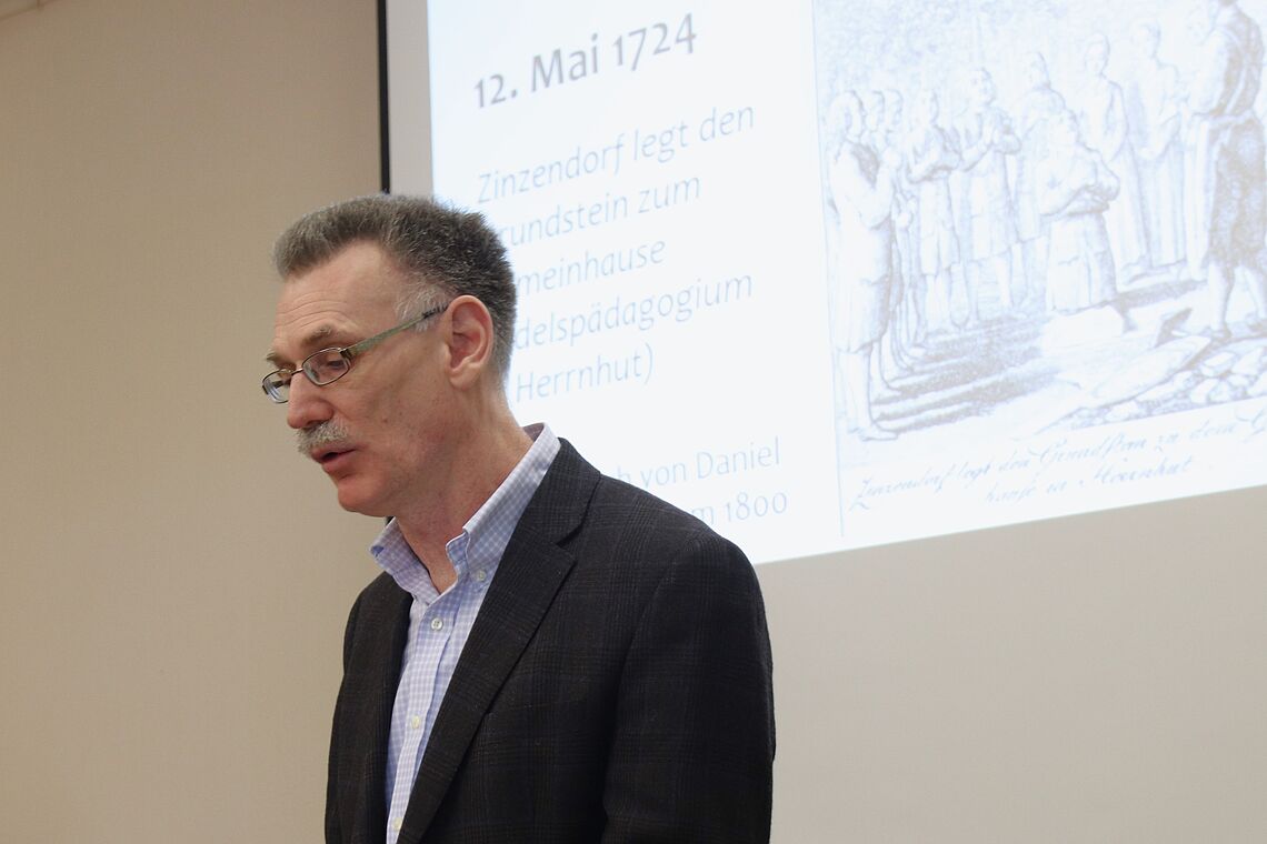 Erster Programmpunkt war ein Vortrag von Pfarrer Dr. Peter Vogt zum Thema „Der Name Zinzendorf als Schulprogramm - Fünf Variationen über ein Thema“ und beleuchtete die Frage, was es bedeutet, wenn eine Schule den Namen „Zinzendorf“ trägt. In spielerischer Auseinandersetzung mit der Person und den Ideen von Ludwig Graf von Zinzendorf verdeutlichte Vogt, wie beides bis heute Einfluss auf die Schulkonzepte der Zinzendorfschulen nimmt.