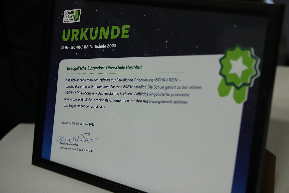 Für ihr Engagement und die große Anzahl der Teilnahmen bei der Woche der offenen Unternehmen Sachsen „Schau Rein“ hat die Oberschule der Evangelischen Zinzendorfschulen Herrnhut eine Auszeichnung erhalten. „Schau rein“ ist eine sachsenweite Initiative zur Berufsorientierung für Schülerinnen und Schüler.