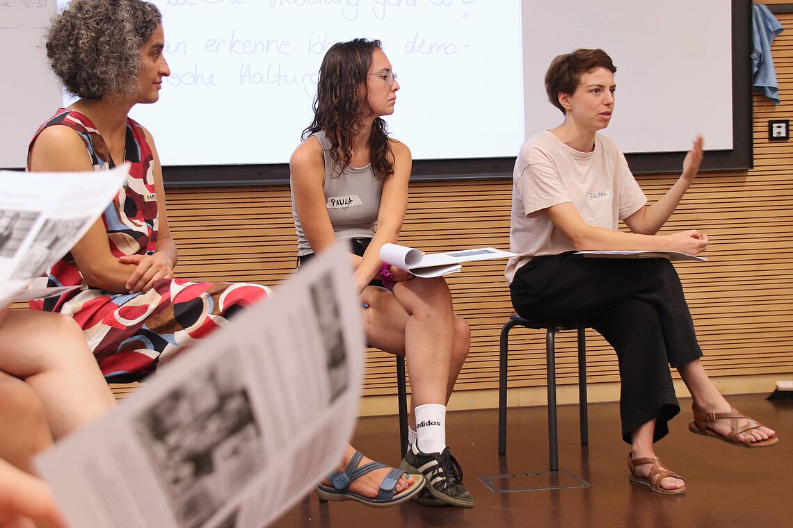 „Die Botschaften und Slogan auf euren Tape Art Plakaten sind perfekt. Damit könntet ihr neue, wichtige Protestbewegungen initiieren“, sagt Nazanin Zandi beeindruckt in der Auswertungsrunde am Ende von Tag 2. Sie hatte die Kunst-Leistungskurse schon im vergangenen Schuljahr bei einem Projekt kennengelernt. „Ihr habt mich das letzte Mal schon von den Socken gehauen und jetzt noch mehr“, erklärt sie gleichermaßen begeistert und berührt von den entstandenen Werken.