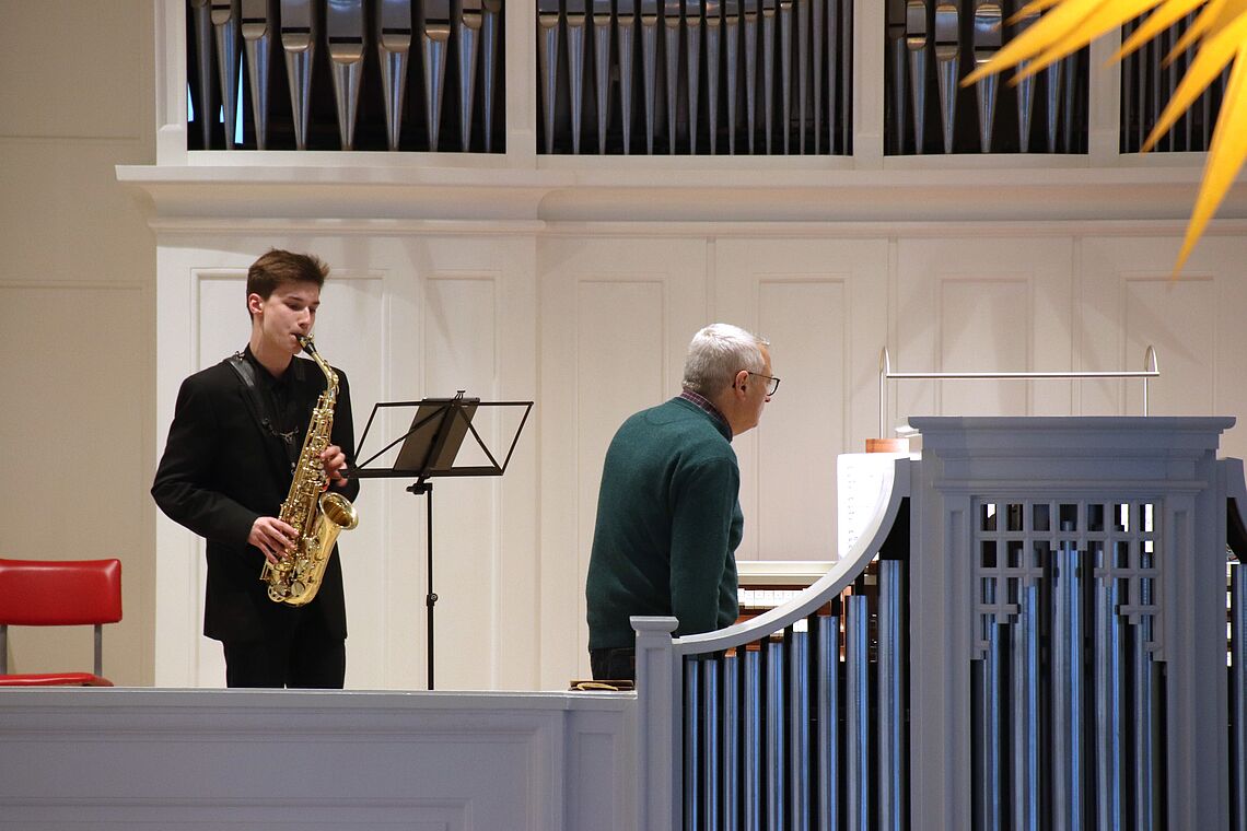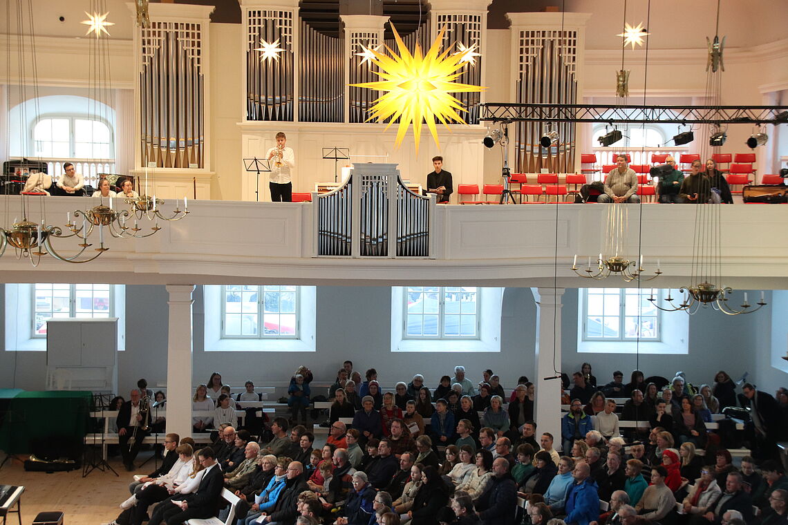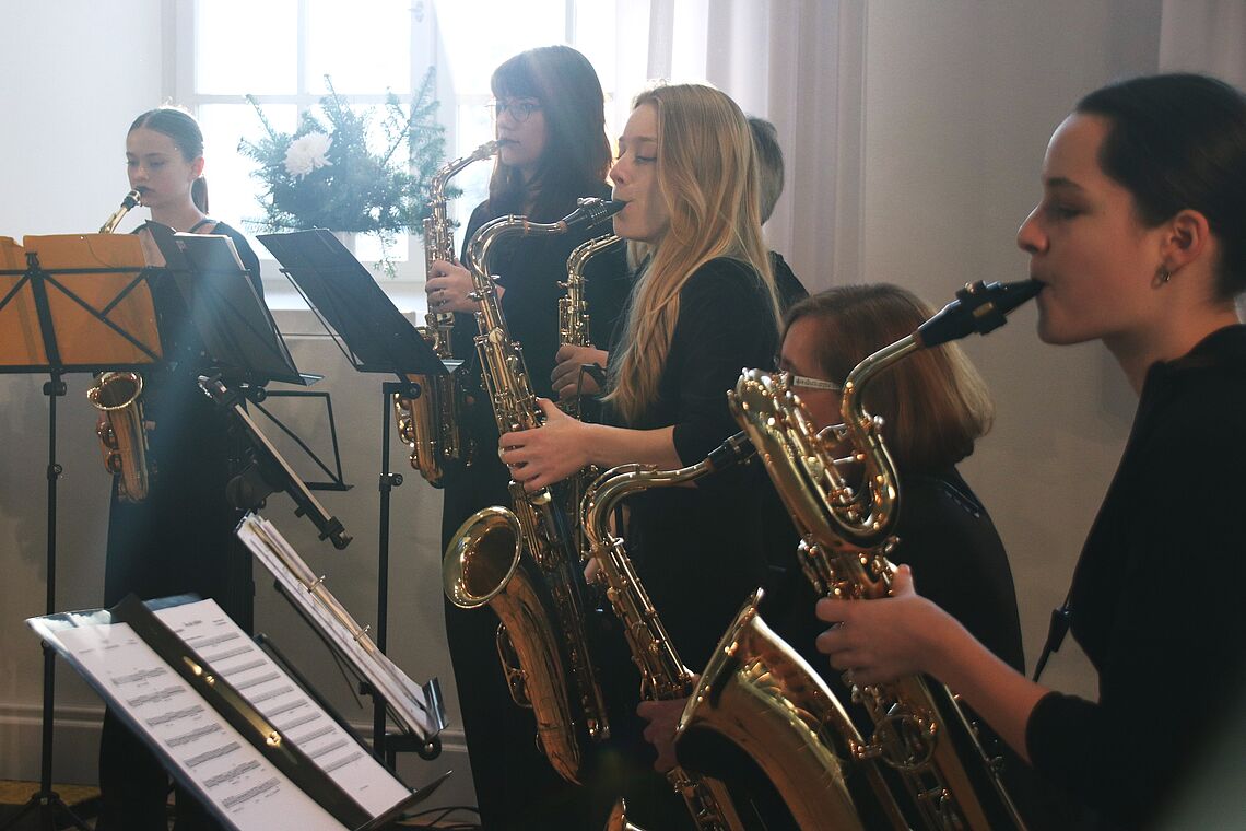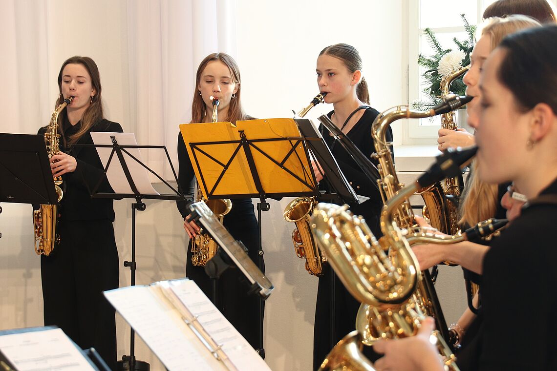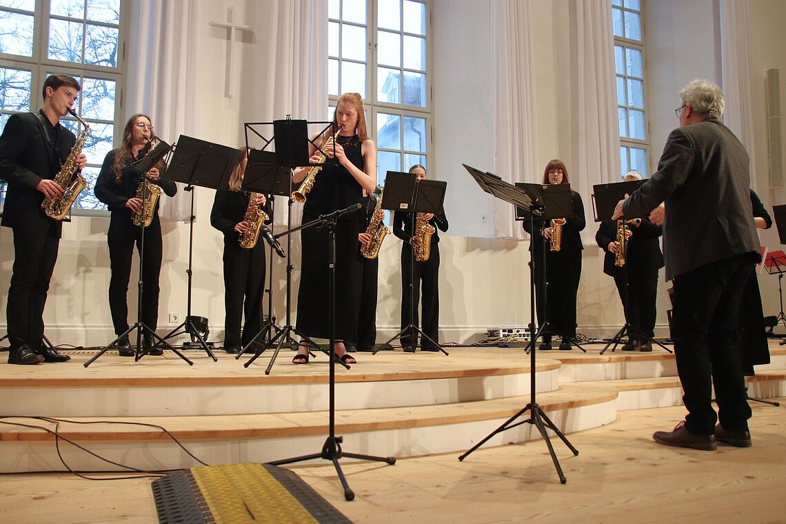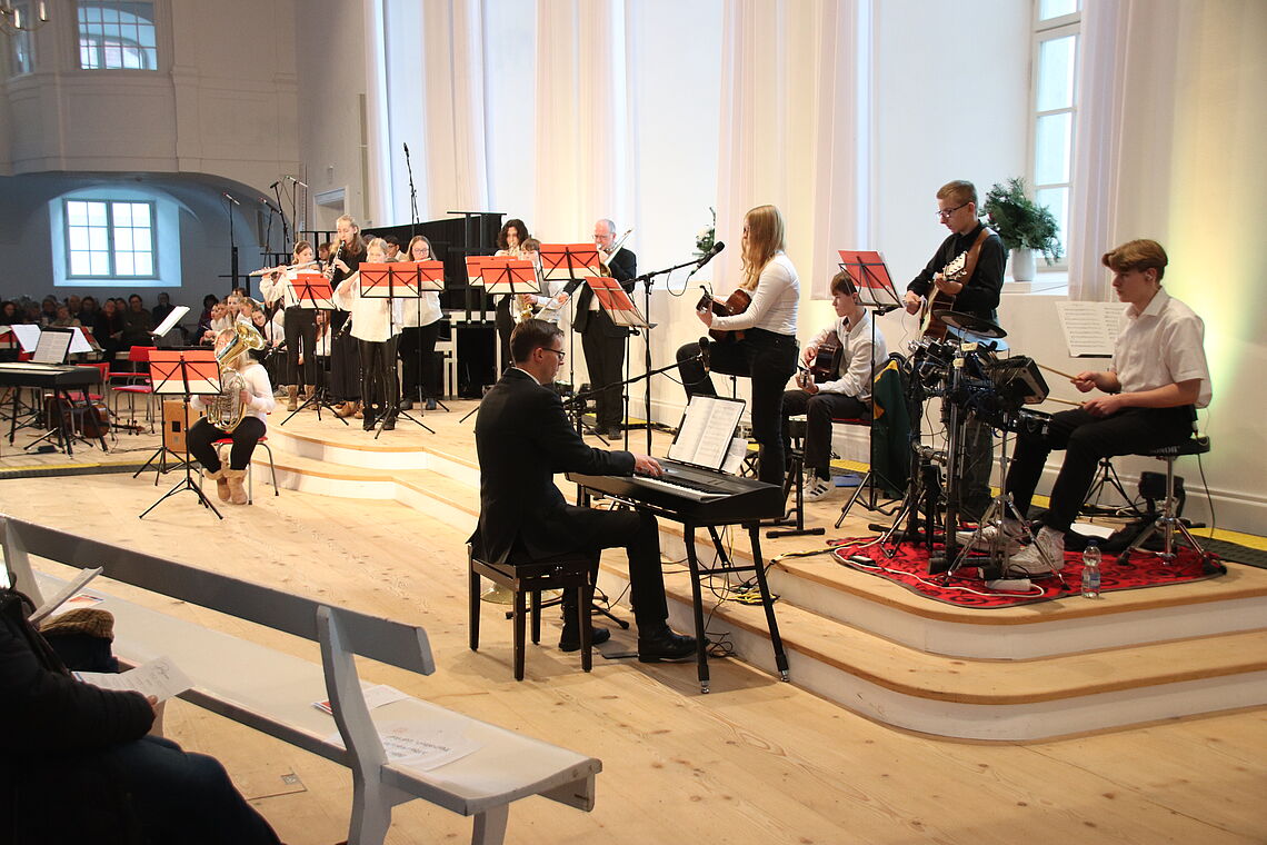 Es musizierten Solistinnen und Solisten der KMS mit Erika Haufe an der Orgel, das Saxophon-Ensemble der KMS unter der Leitung von Ragnar Schnitzler sowie Schulchor, Schulband und BrassBand der Evangelischen Zinzendorfschulen.