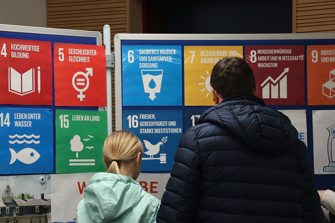 Was die Evangelischen Zinzendorfschulen mit UNESCO zu tun haben, haben Besuchende im zentralsten Raum der Schule erfahren. Dort stellten die Schülerinnen, die beim UNESCO-Projekt Young Climate Action for World Heritage mitgewirkt haben, Spiele zu den Themen Herrnhut, Welterbe und Nachhaltigkeit vor. Ganz im Einklang mit den 17 Zielen für nachhaltige Entwicklung der Vereinten Nationen sind die Bewahrung der Schöpfung und der nachhaltige Umgang mit Ressourcen zwei wichtige Prinzipien unserer Schule und werden an vielen Stellen im Schulalltag gelebt. So zeigten beispielsweise ausgestellte Bilder und Baumaterialien anschaulich die die nachhaltigen Bauweisen des Schulhauses und der Außenanlagen der Zinzendorfschulen.
