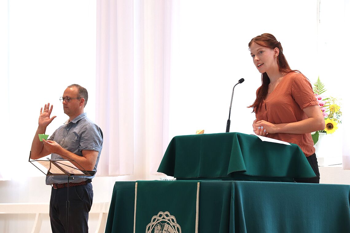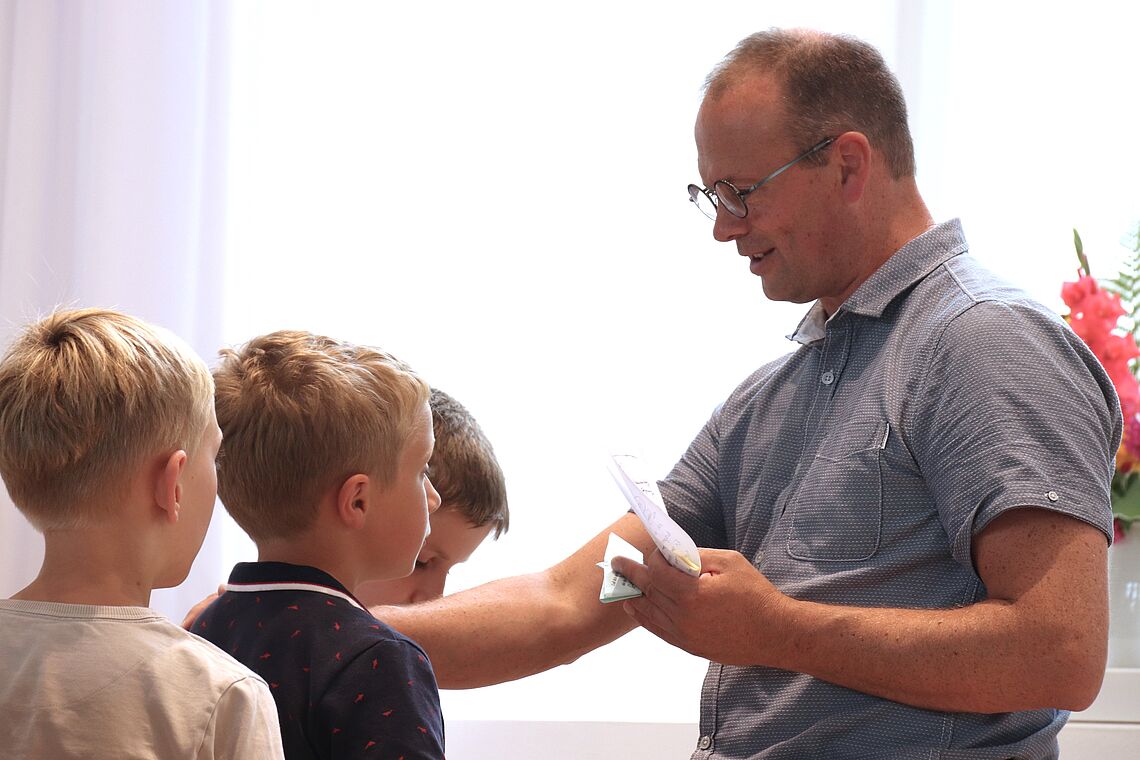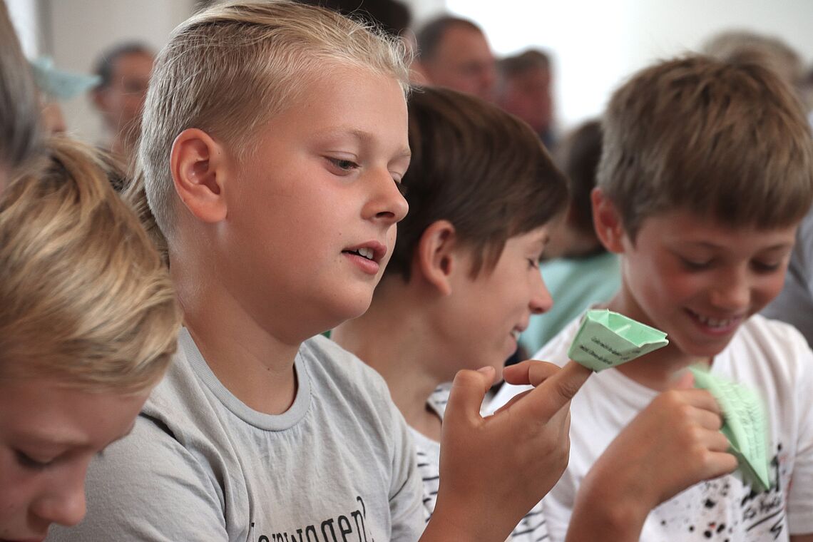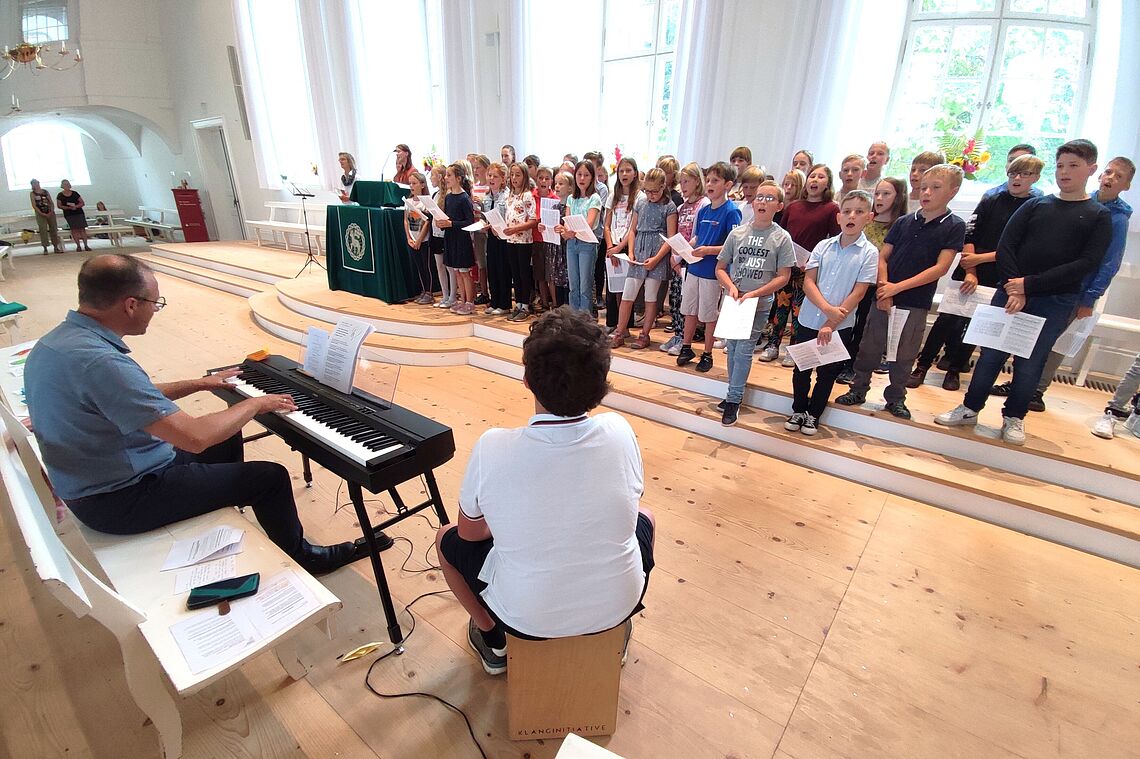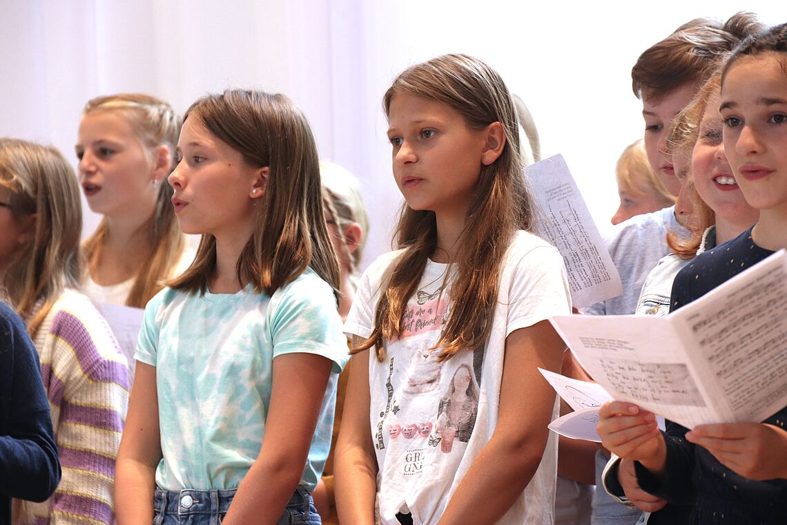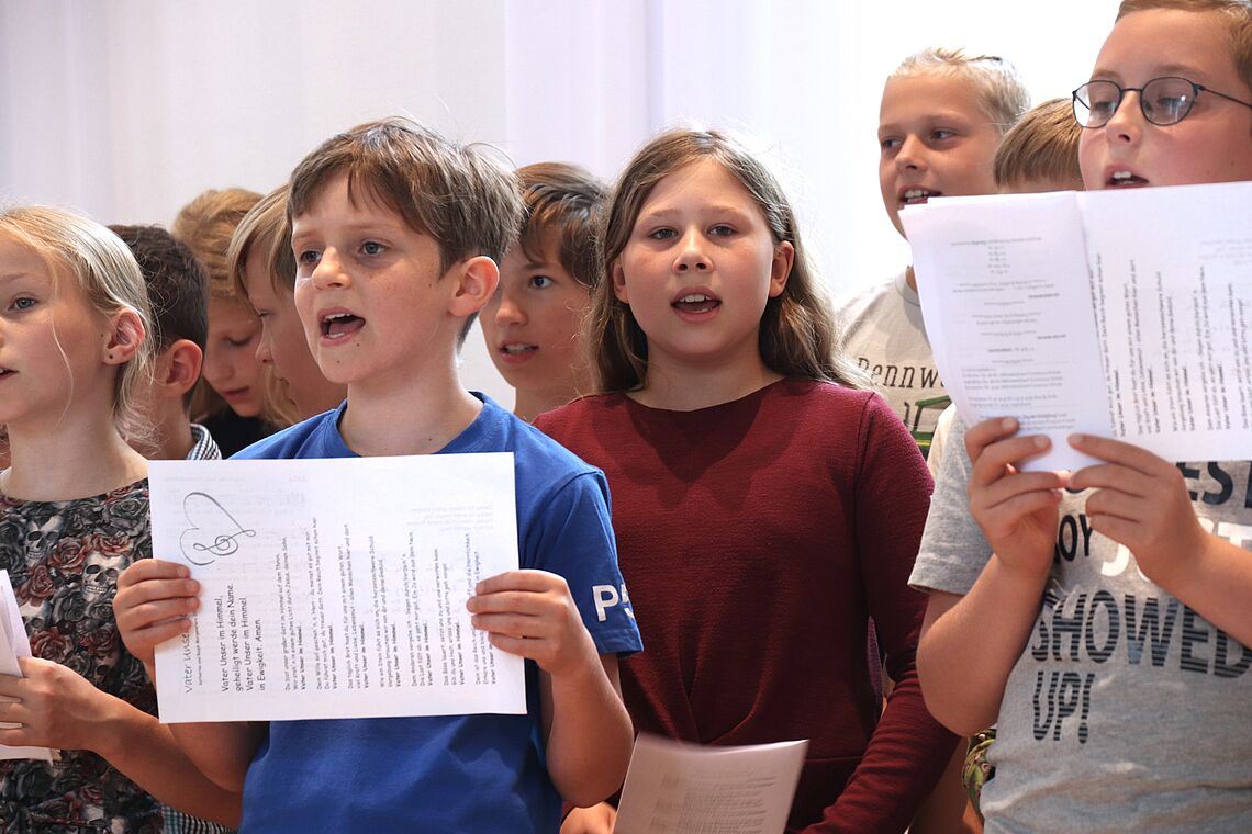 Unter der Leitung eines ihrer Klassenlehrer haben sie über die erste Schulwoche hinweg drei Lieder einstudiert, die sie beim Gottesdienst aufgeführt und gemeinsam mit der Gemeinde gesungen haben. Von „Danke für diese guten Morgen“ auf Deutsch und auf Tschechisch, über „Steig in das Boot“ – passend zum Bootbasteln und der Schiffsgeschichte über Jesus – bis zum vertonten Vaterunser zum Abschluss haben die 5er für Freude, Lebendigkeit und Abwechslungsreichtum beim Gottesdienst gesorgt.