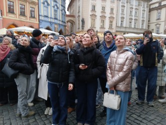 Da wir uns im Unterricht mit den Prager Legenden beschäftigt hatten – insbesondere mit der Geschichte des Baus der Altstädter Aposteluhr – war unser Ziel nicht nur der Weihnachtsmarkt auf dem Altstädter Ring, sondern auch die berühmte Aposteluhr. Um 14 Uhr konnten wir das kleine mittelalterliche „Puppentheater“ der Uhr beobachten.