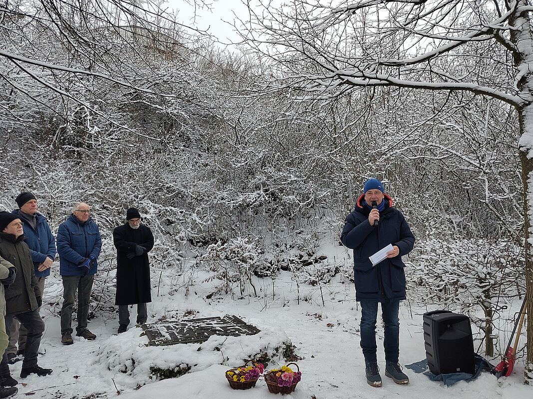 Ebenso anwesend war Bürgermeister Willem Riecke. Auch er machte in seinem Grußwort deutlich, wie wichtig das Erinnern an die Zeit von 1933 bis 1945 ist. Er hob hervor, dass wir alle die Verantwortung tragen, dass wir nicht gleichgültig werden und dass solche Taten nie wieder geschehen dürfen. »Vergib uns unsere Schuld, wie auch wir vergeben unseren Schuldigern. Führe uns nicht in Versuchung.« (Lukas 11,4) Diese Worte bilden den Text auf dem Herrnhuter Gedenkstein. Sie stammen aus dem „Vaterunser“, welches abschließend gemeinsam gebetet wurde.