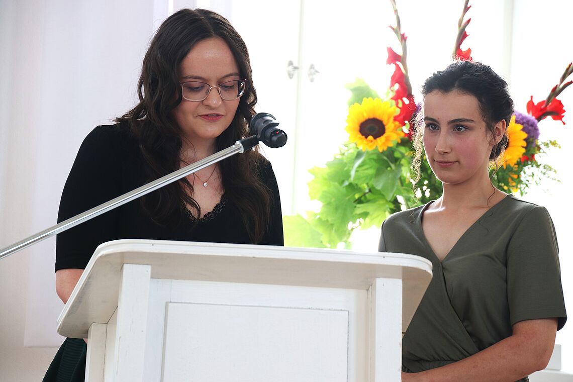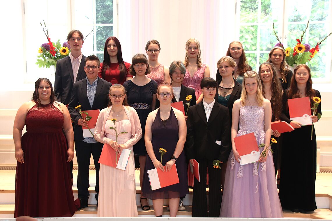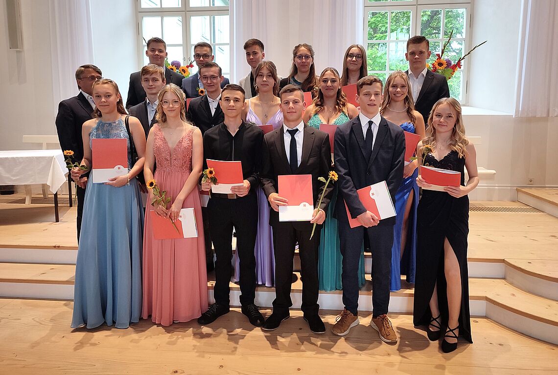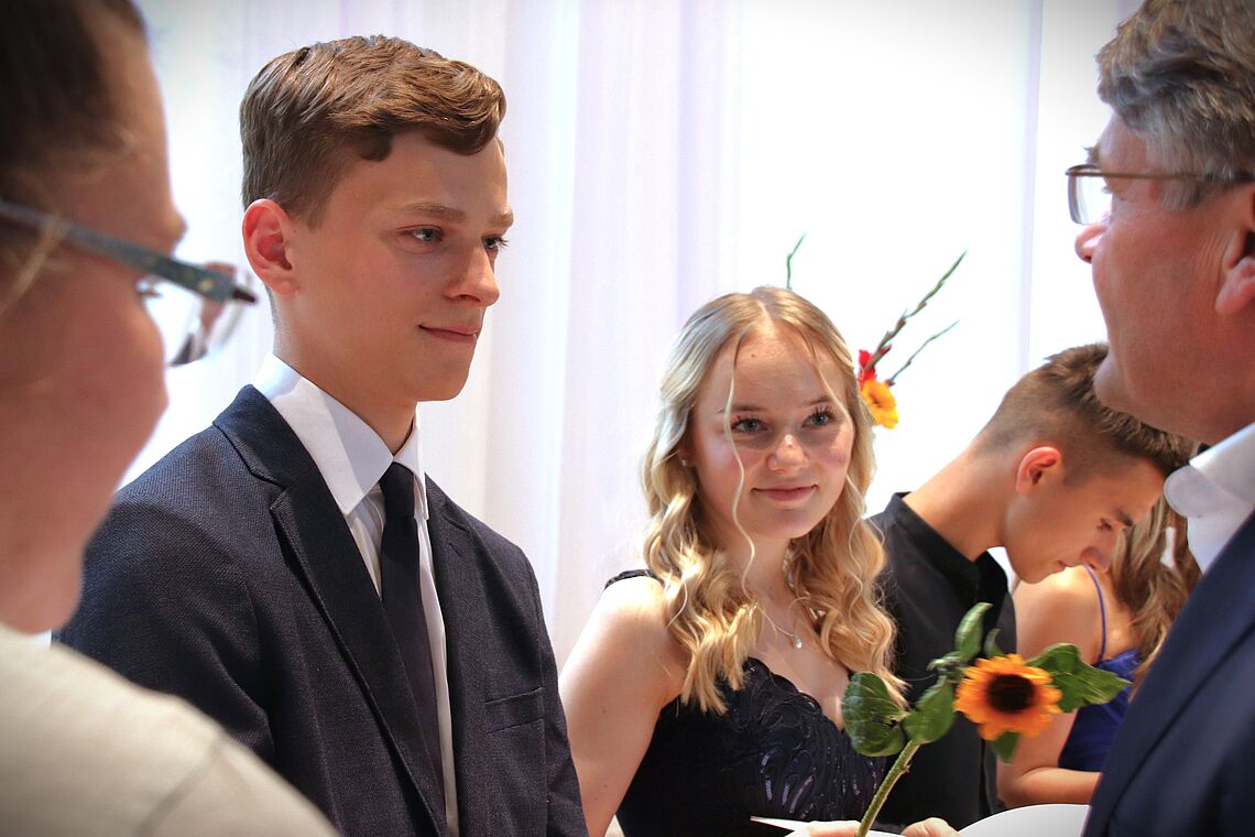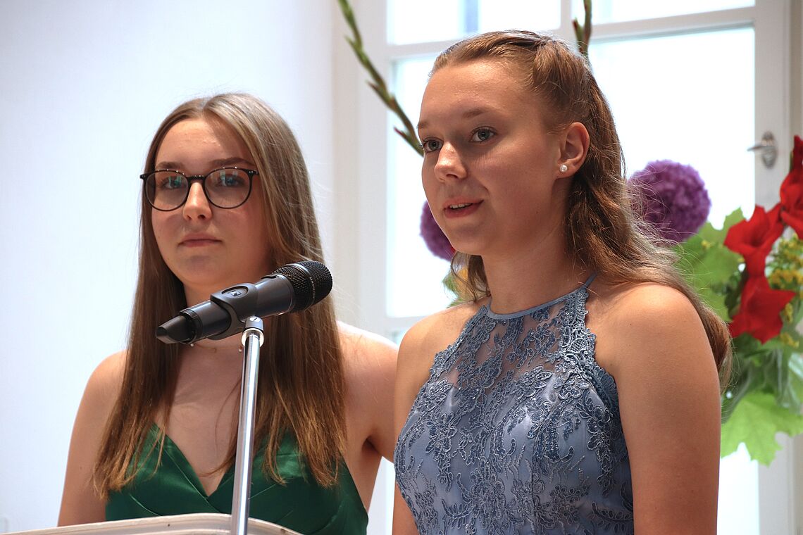 Auch die Schulleitung und die Absolventinnen und Absolventen selbst kamen zu Wort. In ihren Ansprachen, die insbesondere ihre Dankbarkeit zum Ausdruck brachten, erinnerten sie an außergewöhnliche, erfreuliche, aber auch turbulente Ereignisse, über die rückblickend geschmunzelt werden konnte. Besondere Ehrung erfuhren 5 Schülerinnen und Schüler des Abiturjahrganges, die ihren Abschluss mit einer 1 absolviert haben, darunter Hannah Totz, die die Bestnote 1,0 erzielt hat. Ebenfalls sehr bemerkenswert und Grund zur Freude: Vier der fünf Hauptschulabsolventinnen und -absolventen haben einen Qualifizierenden Hauptschulabschluss geschafft.