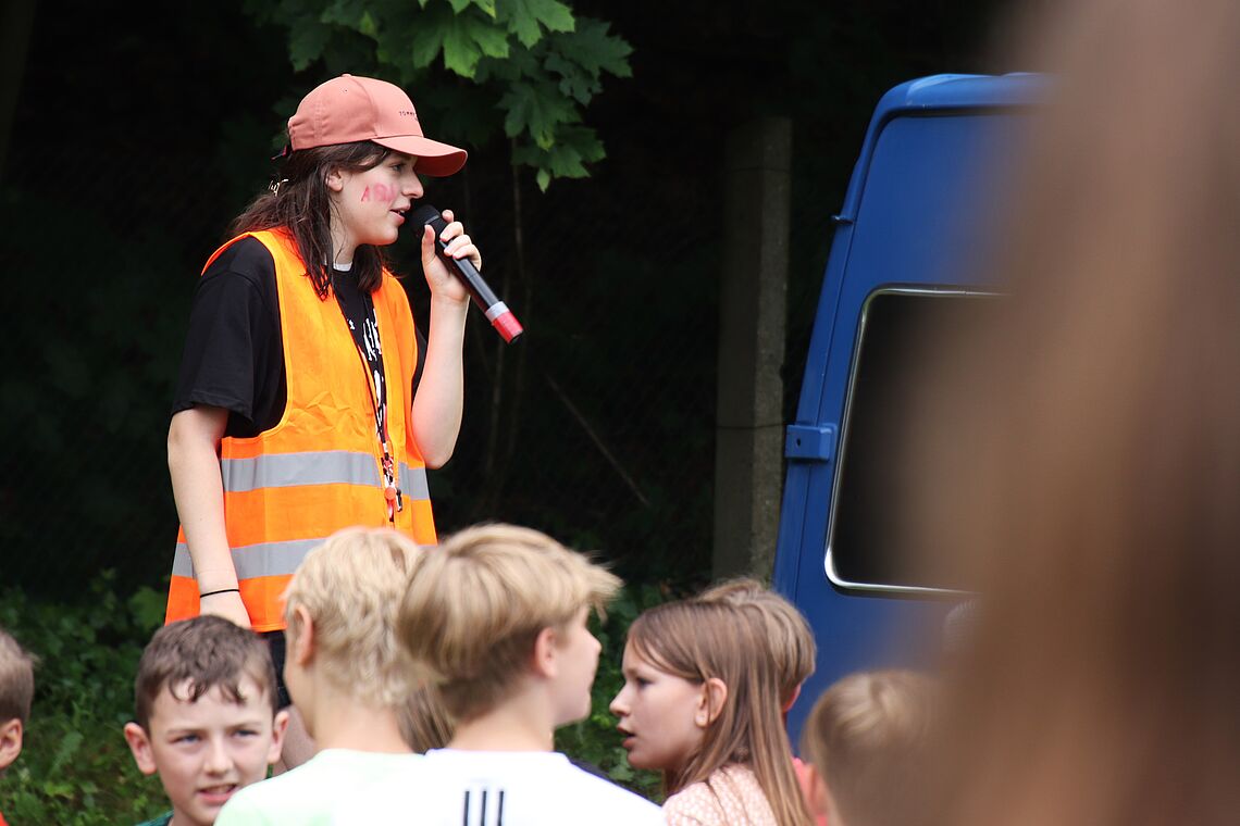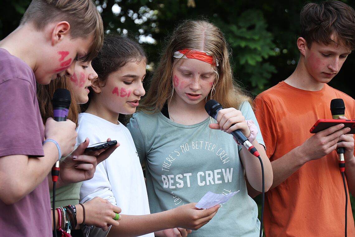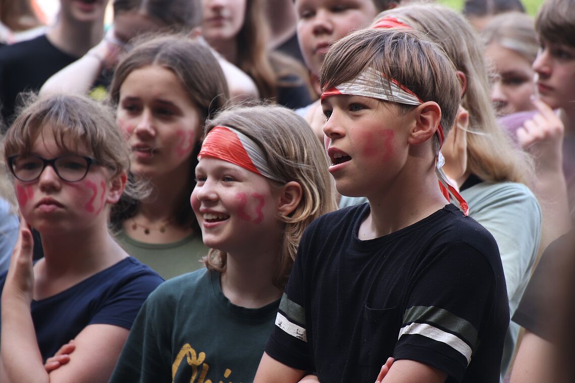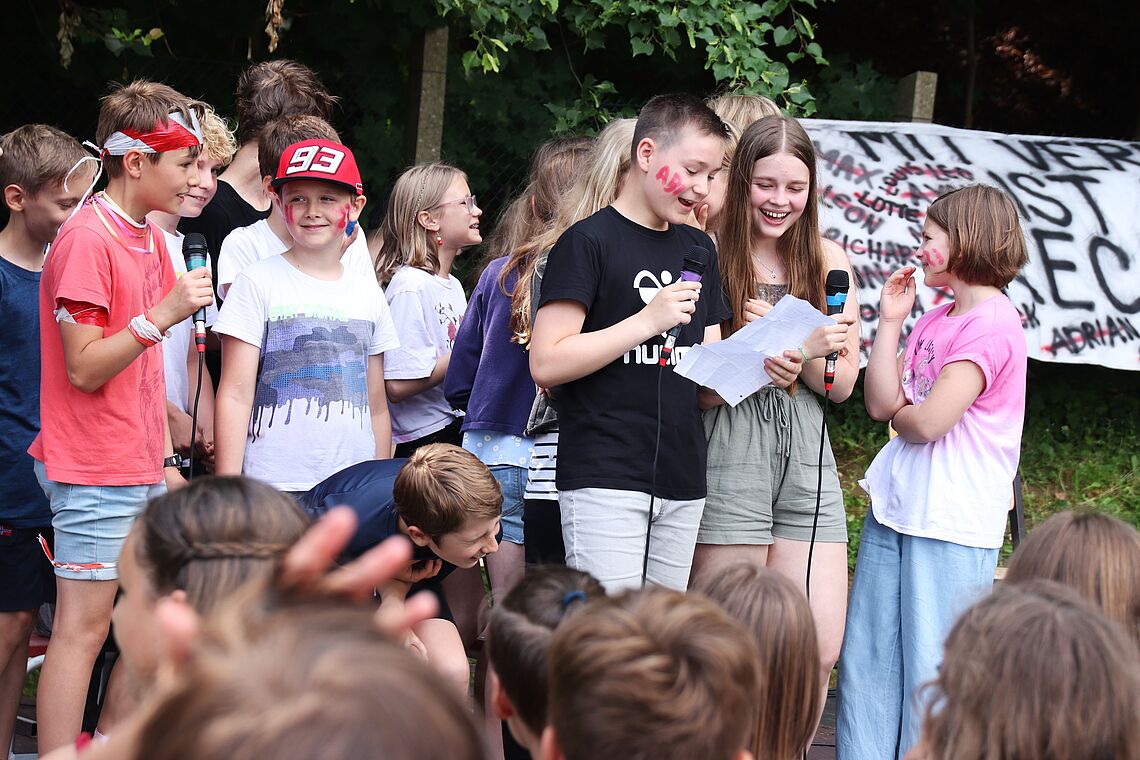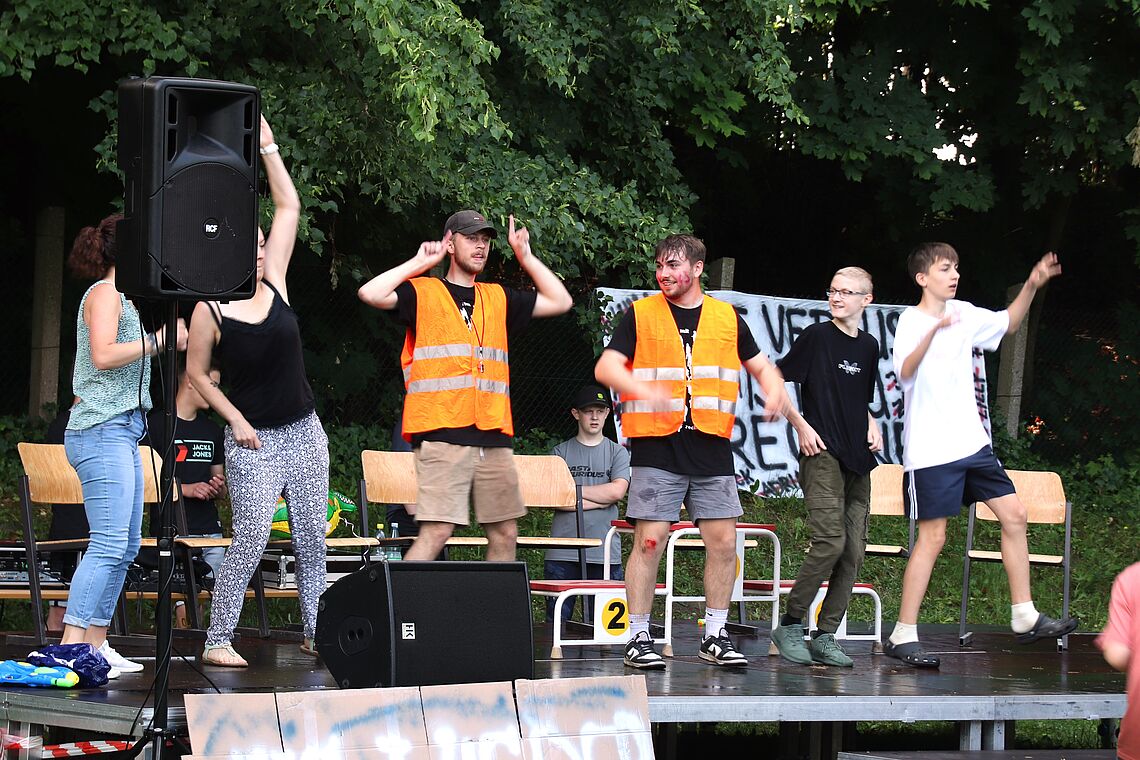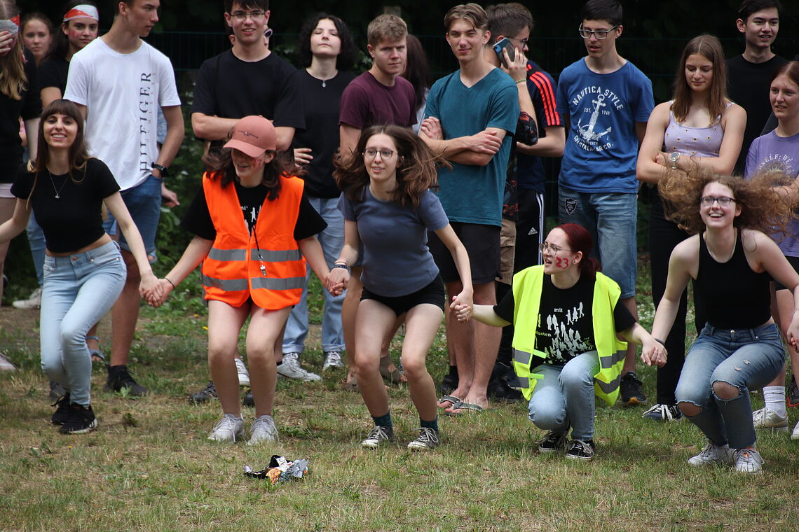 Die Party war ein echter “walk down memory lane”, also ein Rückblick auf die einzelnen Schuljahre der Abiturientinnen und Abiturienten. Denn die Spiele und Herausforderungen, zu denen die einzelnen Klassenstufen von 5 bis 11 antreten mussten, standen immer symbolisch für besondere Ereignisse und Erlebnisse, die das jeweilige Schuljahr der Absolventinnen und Absolventen geprägt hat. So mussten beispielsweise die 6er, angelehnt an den Deutschunterricht, den die 12er ihrerseits in Klassenstufe 6 erlebt hatten, klassische Balladen rappen. Die 8er wiederum hatten die Aufgabe, einen Tischtennisball auf einem Stapel Umzugskartons balancieren, weil die Schulgemeinschaft während des 8. Schuljahres unserer Abiturientinnen und Abiturienten vom alten in das neue Schulhaus umgezogen ist.
