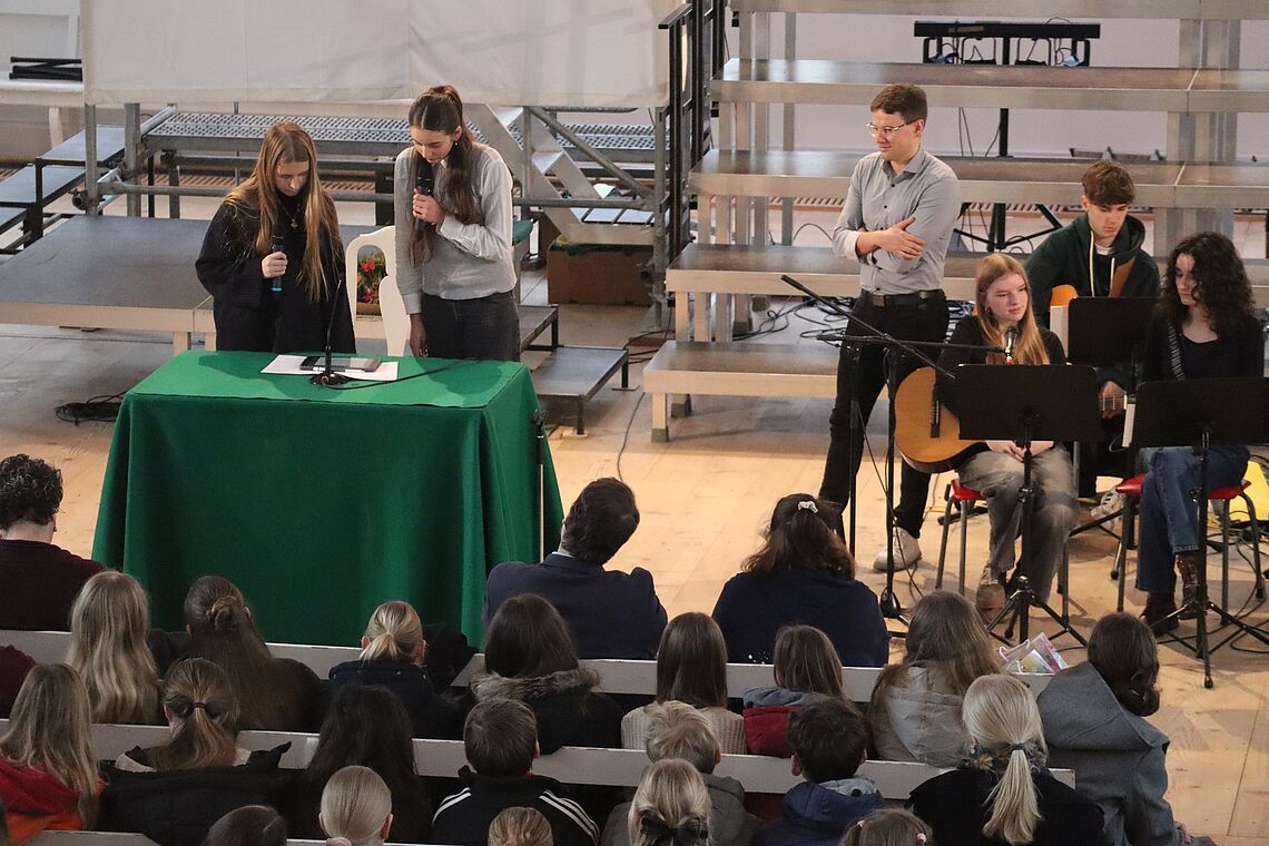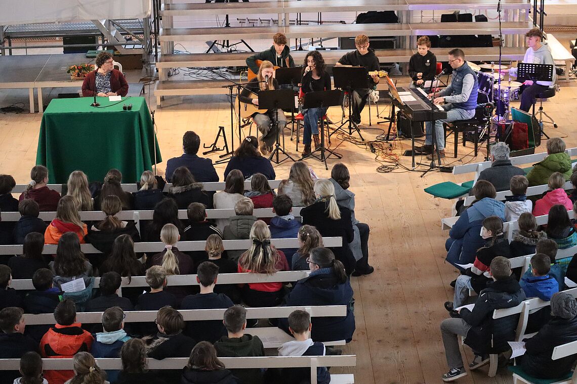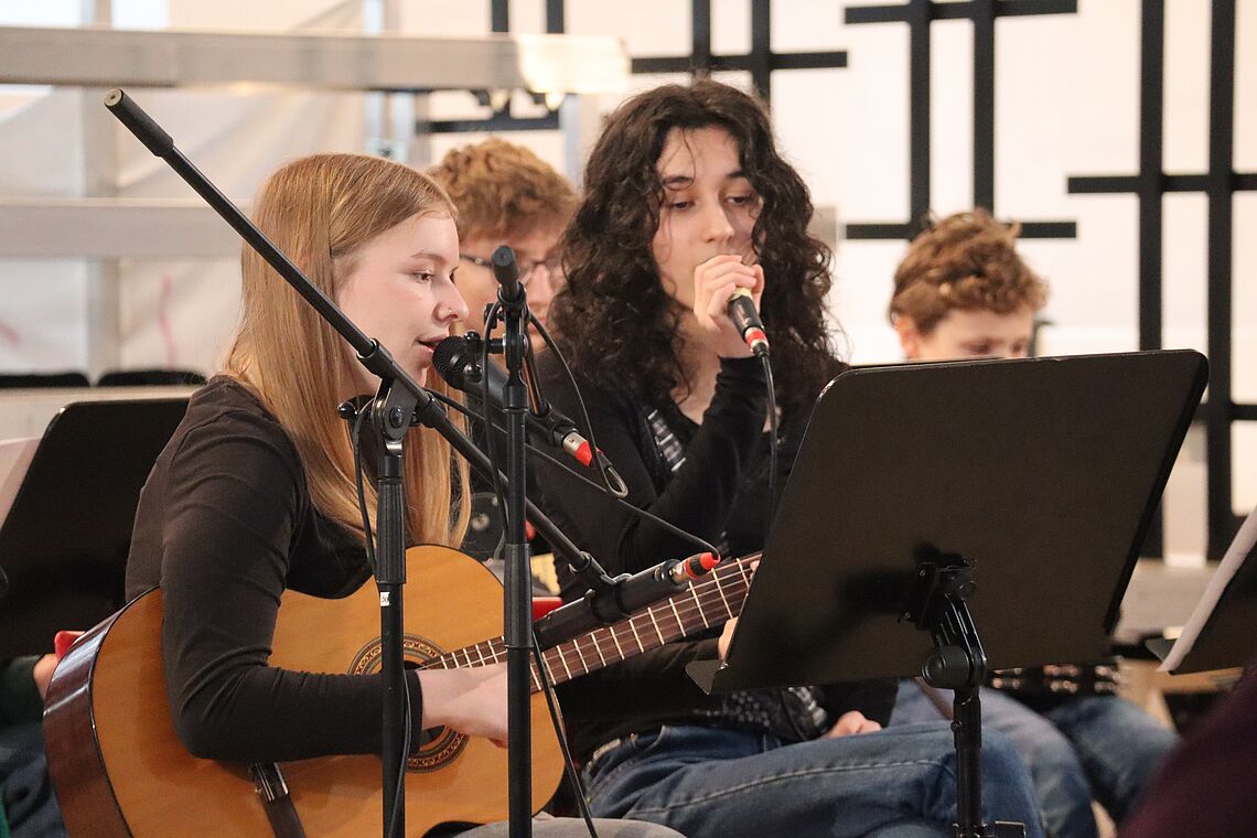 Darüber hinaus sorgte unsere Schulband für eine schwungvolle musikalische Gestaltung des Gottesdienstes. Ob beim Zuhören oder wie bei den Klassikern „We shall overcome“ und „Hevenu Shalom“ beim Mitsingen – die Begeisterung im Kirchsaal war spürbar.