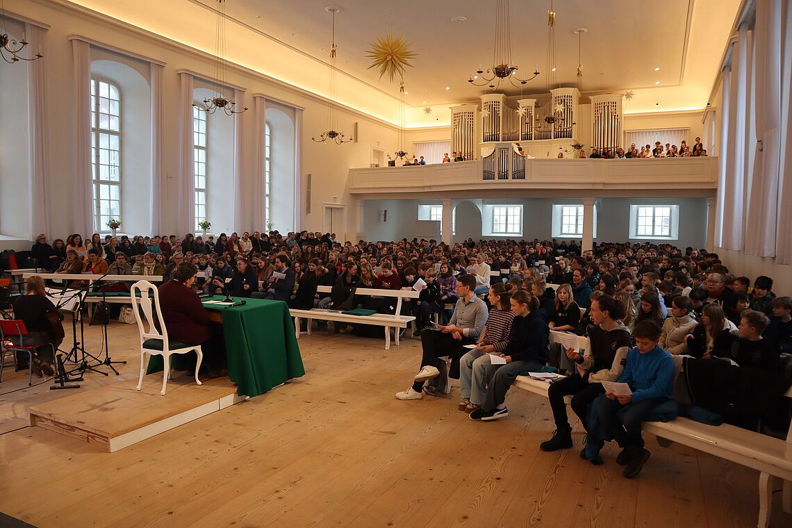 Am letzten Schultag vor den Winterferien feierten wir in der Schulgemeinschaft der Zinzendorfschulen einen fröhlichen und schwungvollen Gottesdienst zum Ende des ersten Schulhalbjahres. Der Gottesdienst wurde von Schülerinnen und Schülern der Klasse 8-2 gemeinsam mit ihrem Religions- und Lateinlehrer Herr Mehn gestaltet. Ausgehend von der Tageslosung ging es dabei um die Frage der Gerechtigkeit, die sich für viele Schüler auch immer wieder anhand der Noten und Bewertungen in der Schule stellt. Am Ende stand aber die Erkenntnis, dass die Frage der Gerechtigkeit zwar ein großes und vielschichtiges Thema ist, entscheidend aber ist vielmehr, dass ein Zeugnis oder eine Halbjahresinformation nur eine kleine Teilaussage über einer Person darstellt und niemals den Wert der Person als Mensch bestimmt. Gottes Gerechtigkeit ist weit größer als unsere manchmal kleinlichen irdischen Regeln. Gottes Gerechtigkeit ist die Liebe, die allen Menschen gleich zu Teil wird.