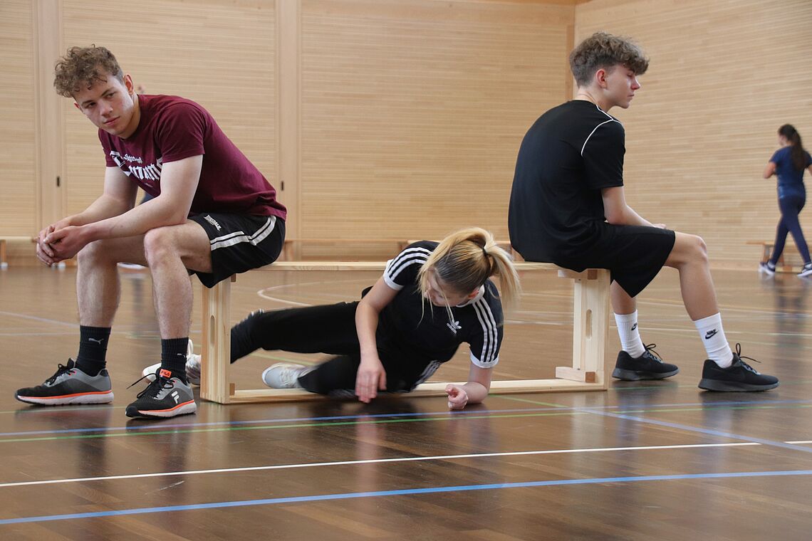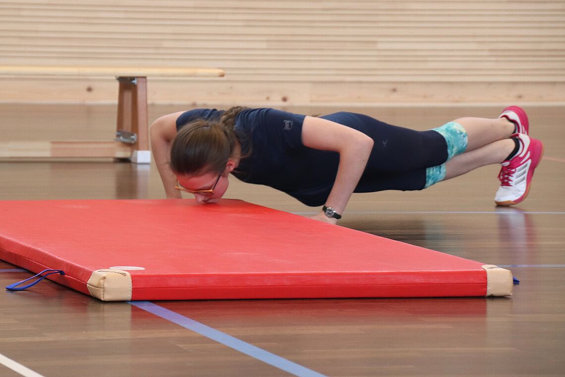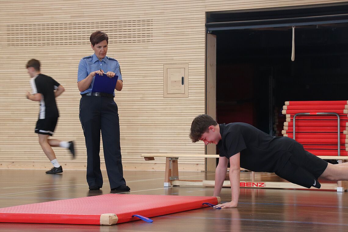 Den Aufnahmetest, der die sportliche Eignung überprüft, konnten die Interessierten im Anschluss gleich selbst ausprobieren. Dort mussten Ausdauer, Kraft, Beweglichkeit und Koordination bei einem Lauf auf Zeit, Liegestützen und dem sogenannten Kasten-Bumerang-Test unter Beweis gestellt werden.