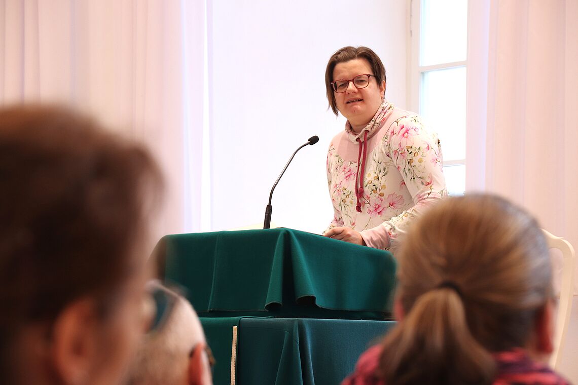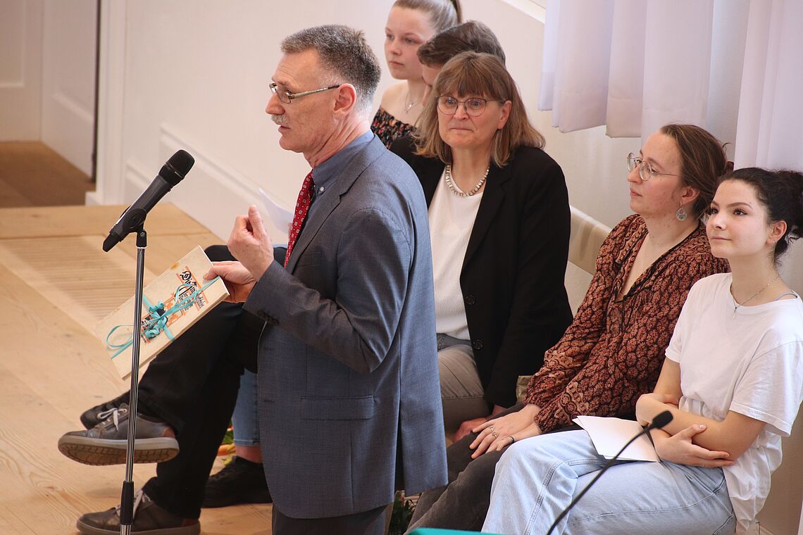 In seinem Grußwort blickte Bruder Kottnik zurück auf Frau Benschs Anfänge 1992 an der damals staatlichen Schule und ganz besonders auf das Frühjahr 2005. Ab da wirkte Frau Bensch bei der Gründung des Zinzendorf-Gymnasiums mit. Frau Filschke, die die Gründung des Zinzendorf-Gymnasiums als Projektleiterin auf den Weg gebracht und die Zinzendorfschulen viele Jahre gemeinsam mit Frau Bensch geleitet hatte, ließ Frau Bensch raten, mit wie vielen Schülerinnen und Schüler bzw. deren Familien sie in ihrer Zeit an den Zinzendorfschulen Kontakt hatte. Über 2.000 waren es. Auch die Zahl der Mitarbeitenden, mit denen sie in ihrer fast 19-jährigend Dienstzeit zusammengearbeitet hat, musste Frau Bensch schätzen. Dass es über 230 waren, hat sie dann doch überrascht. Zum Dank für ihren Verdienst um die EZSH erhielt Frau Bensch eine „schlösserlandKarte“, die der nun ehemaligen Deutsch- und Geschichtslehrerin freien Eintritt in die Schlösser und Parks in Sachsen gewährt.
