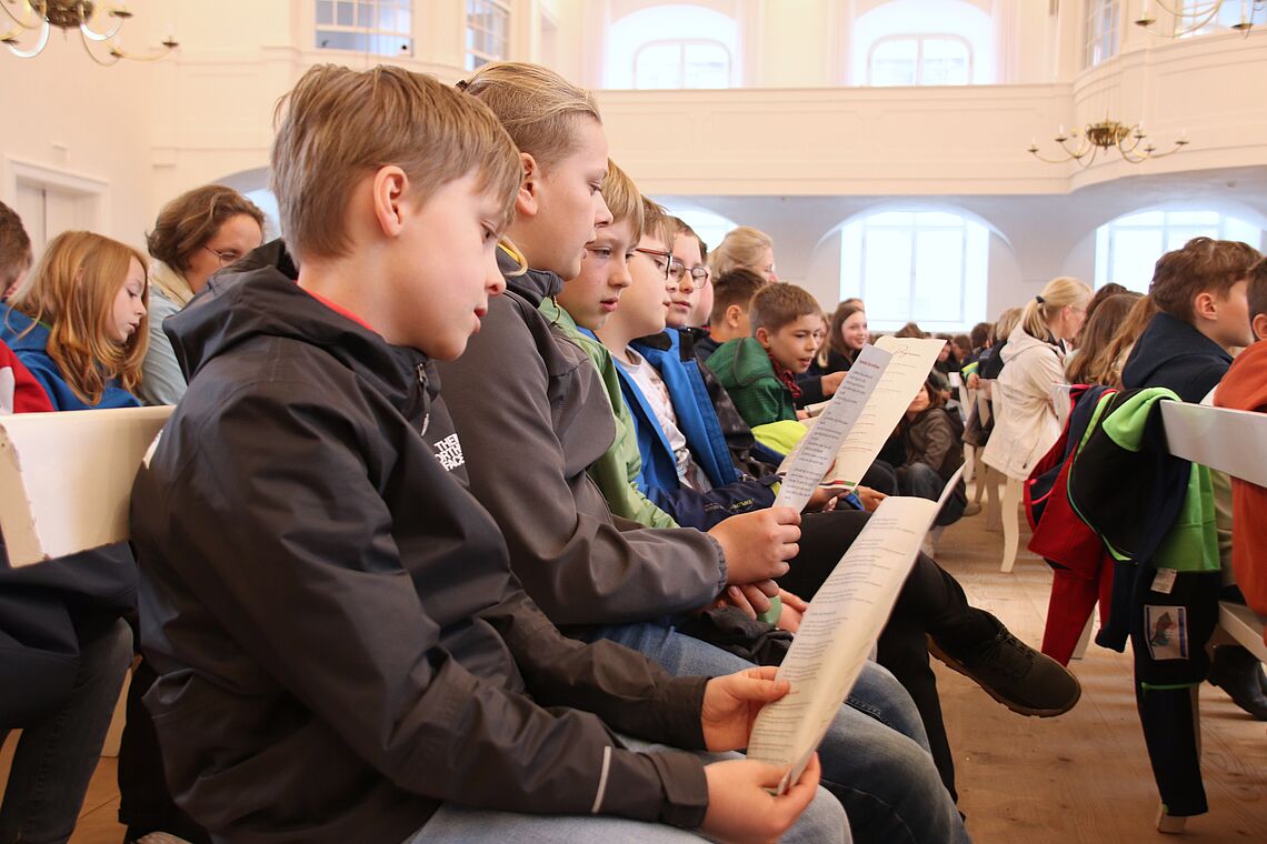 Auf die Frage, welches Motto sie über ihre Zeit als Schulleiterin stellen würde, nannte Frau Bensch das Lied „O Gott, du frommer Gott“, in dem es um Gottvertrauen geht und um seinen Beistand und seine Führung bei der alltäglichen Arbeit gebeten wird. Gleich drei Mal fand sich das Lied so im Gottesdienstprogramm wieder: Es war der zentrale Gegenstand der Predigt des Schulpfarramtes, es wurde von den Anwesenden als gemeinsames Lied gesungen und, ein kleiner Höhepunkt, auch von einem Chor aus Mitarbeitenden der EZSH und Mitgliedern der Herrnhuter Brüdergemeine, der sich extra für diesen Zweck formiert hatte.