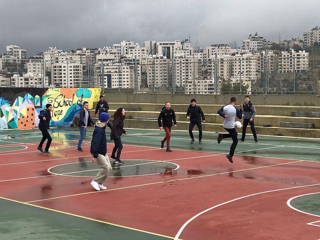 Auf dem Pausenhof lief während der Hof-Pause laute Musik und die Schüler*innen saßen zusammen in Gruppen oder haben Fußball, Tischkicker oder Basketball gespielt. Alle waren sehr sympathisch und man konnte sich sehr gut und offen mit ihnen unterhalten. Im Grunde genommen haben sich sehr viele Gemeinsamkeiten aufgezeigt. Der Besuch war eindrucksvoll und hat mir ein neues Bild der israelischen Jugend gegeben.“